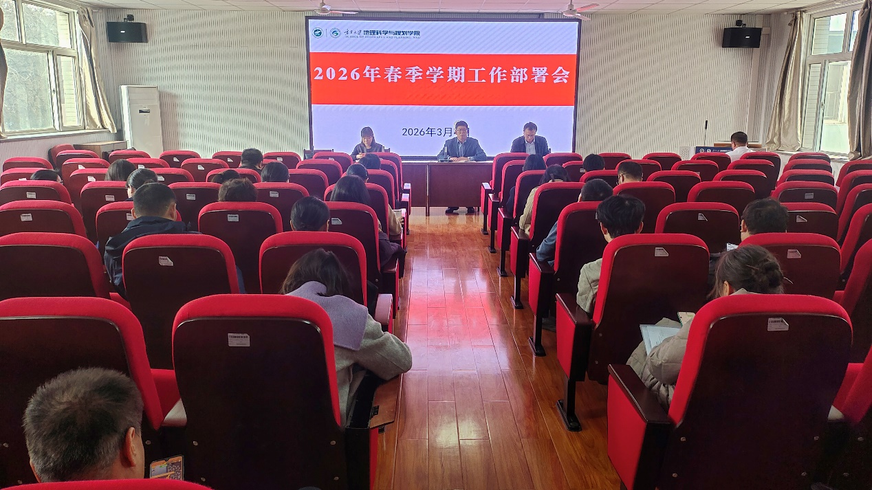 为深入学习贯彻学校2026年工作部署会精神,明确任务、统一思想,3月4日,地理科学与规划学院召开2026年春季学期工作部署会。学院党总支书记陈军胜主持会议并作动员,院长文琦全面部署学院2026年重点工作,副院长李茜安排分管领域工作,学院全体教职工参加会议。