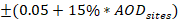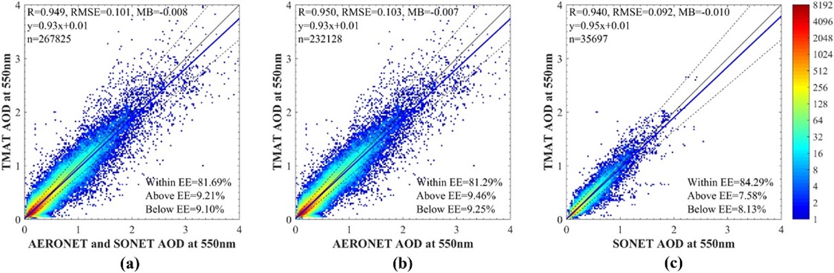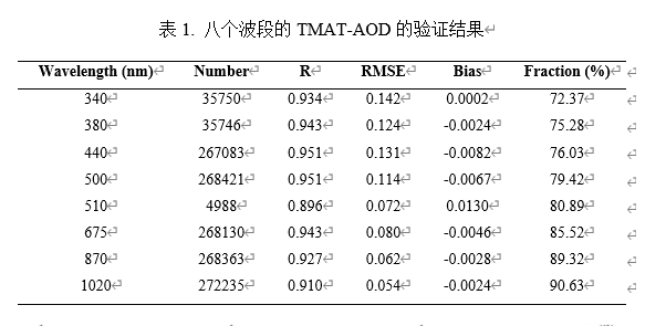 图1.基于留一站交叉验证法的550nm波段的TMAT-AOD的验证结果