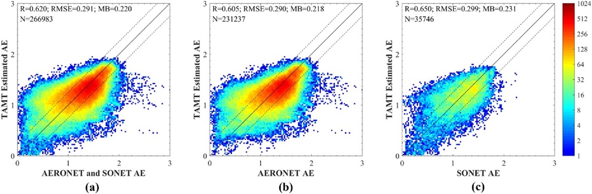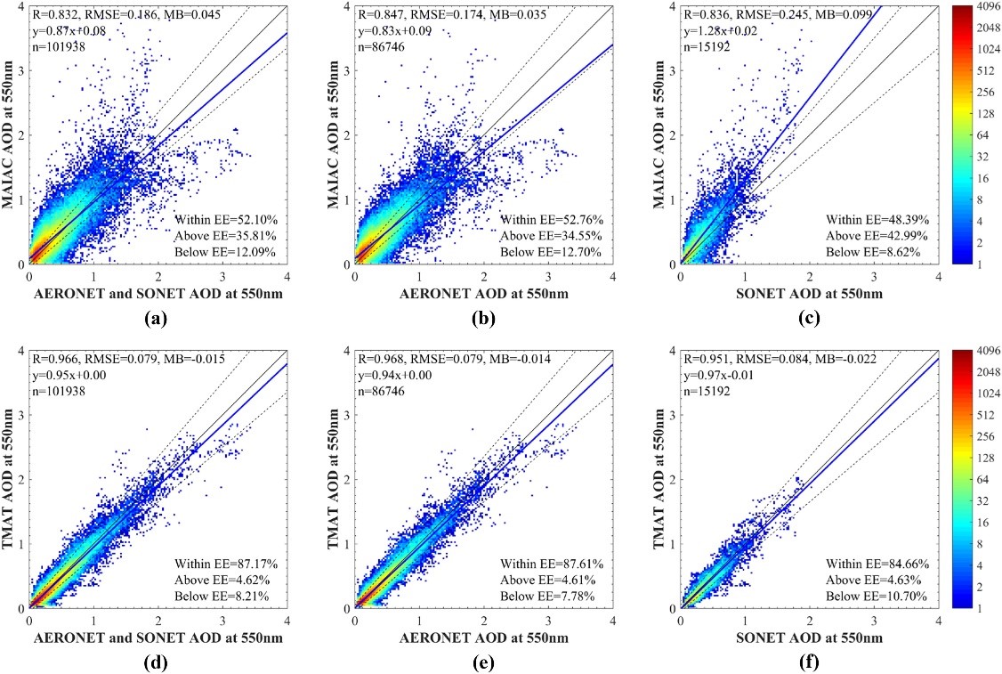 图3. TMAT-AOD和AHI-MAIAC AOD的验证比较。其中,AHI-MAIAC AOD为基于AHI数据和MAIAC算法生成的AOD数据集。