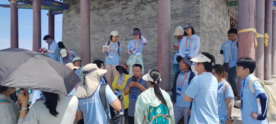 8月7日下午实习队伍前往右玉牛心山。在牛心山火山地质点,一座形成于上新世火山活动的锥状山体,以其发育良好的玄武岩柱状节理被誉为“天然地质课堂”。北京大学刘耕年教授在现场教学中,结合节理构造系统阐释了火山喷发物质的相态特征与岩浆演化过程;华东师范大学郑祥民教授则通过对比我国多处典型火山锥的地貌与成因,分析了它们之间的异同关系。同学们俯身细致观察玄武岩中清晰可见的气孔构造与杏仁体充填特征,切身感受来自数千万年前地球内部强烈地质活动所遗存下的珍贵信息与解码线索。