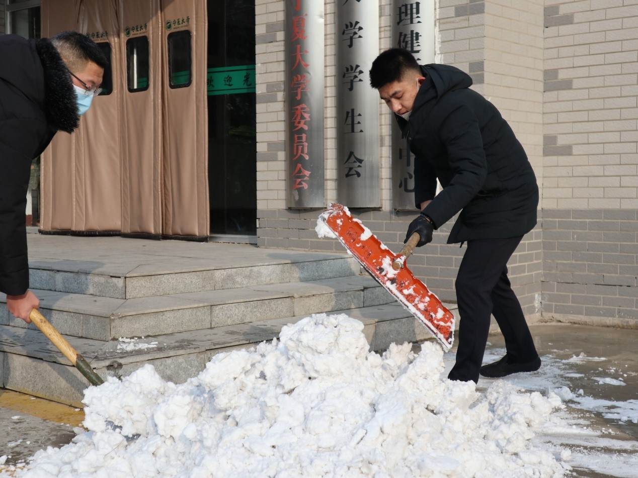 组织学生于2020年12月3日进行校园积雪清扫活动。在线德州扑克辅导员常瑞敏老师和王兴老师参加此次清扫活动。