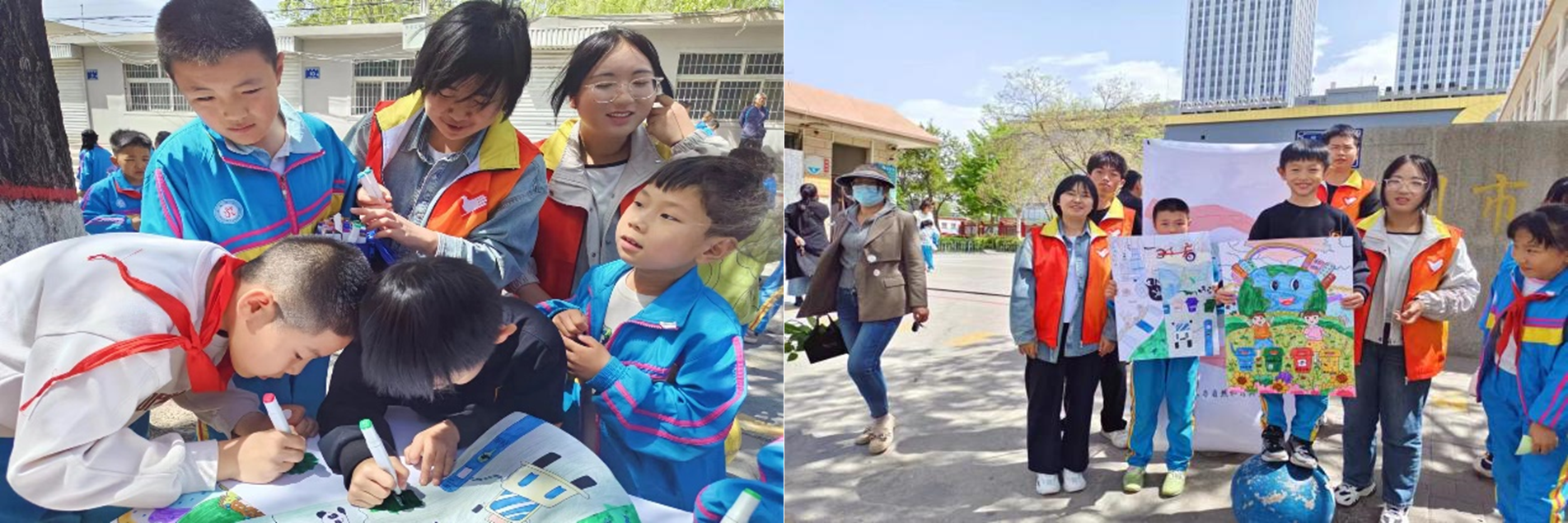 在银川市西夏区第九小学,贺鑫杰等同学通过普及世界地球日相关知识、邀请小学生们亲自手绘等形式进行宣传。